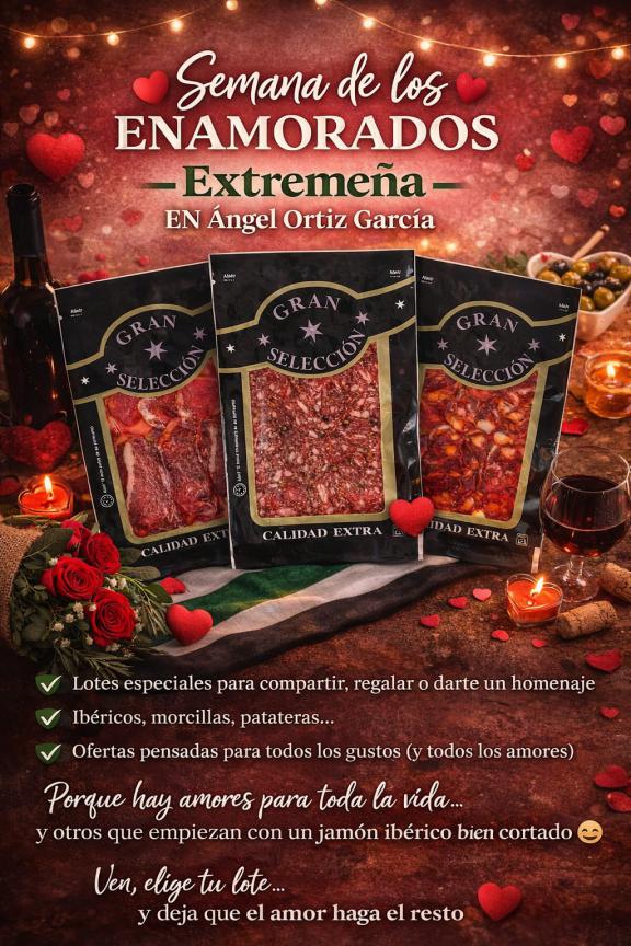 "Díselo con sabor. Este San Valentín, regala un cuarteto irresistible: nuestro Lote de los Enamorados. Una selección exclusiva de Jamón, Lomo, Chorizo y Salchichón para compartir momentos que alimentan el corazón."
